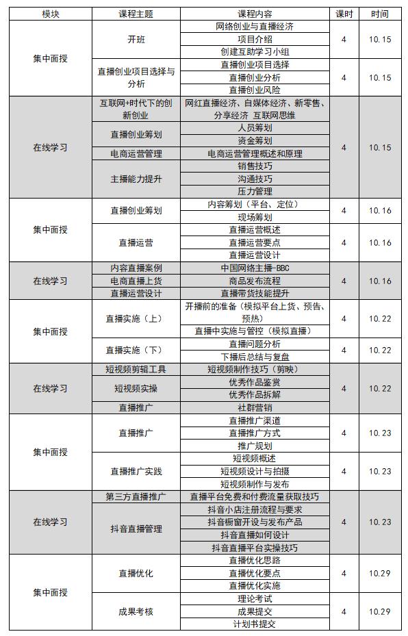 本期课程计划在10月15日—10月29日期间进行,每周六、日集中授课。教室安排根据招生情况在3044永利网站另行通知。课程实训模块介绍见表1。