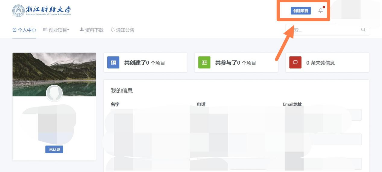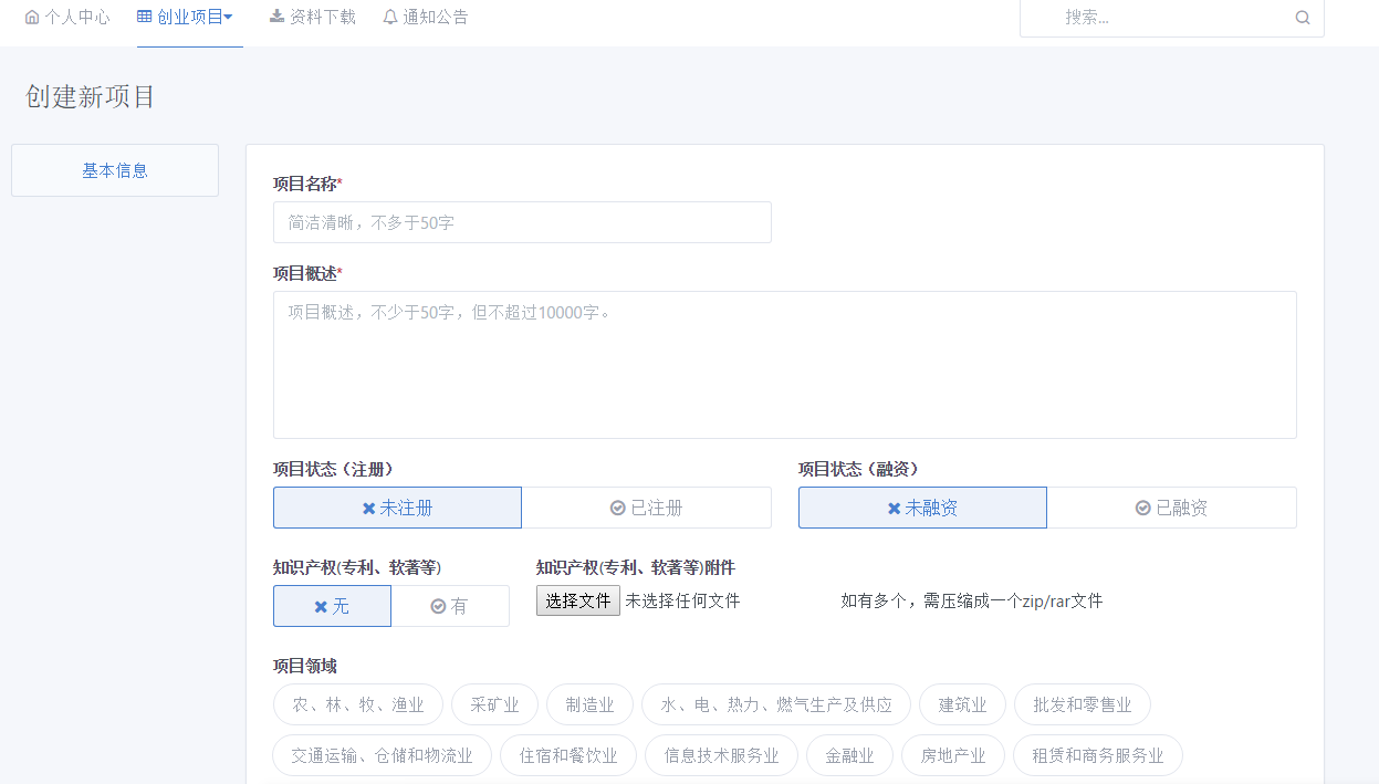 2、登录后创建自己团队的项目,填写相关项目信息,参赛意向选择创业园入驻。如有需要,可参考附件创业计划书模板提交创业计划书文件,ppt,word,pdf格式均可。