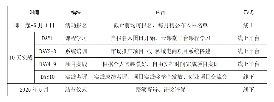 本期训练营将择优选拔优秀创业实践团队,参与项目培训、实战训练等环节,训练营将为员工免费提供“无成本、无风险”的营销推广及创业实践项目,发掘个人创业潜能,深刻探索自己,培养青年创新能力和发现及解决问题的能力,提升自我影响能力、团队协作能力、领导管理能力、增加社会责任感等综合素能,提升未来的就业与创业市场竞争力。