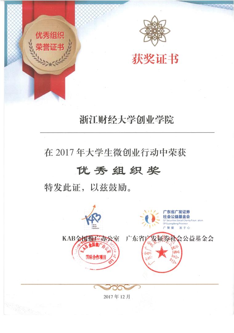 公司作为2017年全国微创业行动协办院校之一,结合公司实际,协助KAB全国推广办公室深入开展微创业项目征集、宣传、孵化等组织工作,承办了老员工微创业行动浙江省决赛,工作成效突出,作为20所高校典型之一被主办方再次授予“2017年全国老员工微创业行动优秀组织奖”,这也是公司第二次获得老员工微创业行动优秀组织奖。