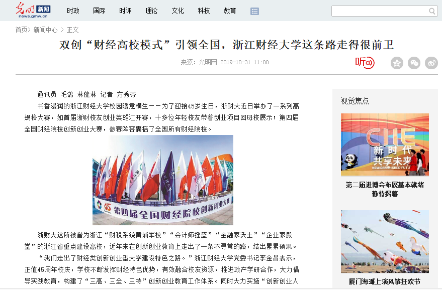 10月30日,《光明网》《杭州日报》、《杭州网》《网易》、《今日头条》、《凤凰新闻》等媒体以《双创“财经高校模式”引领全国,3044永利集团这条路走得很前卫》为题,大篇幅报道了公司不断发挥财经特色优势,有效融合员工资源,推进政产学研合作,大力倡导实践教育,构建“三高、三全、三特”创新创业教育工作体系。
