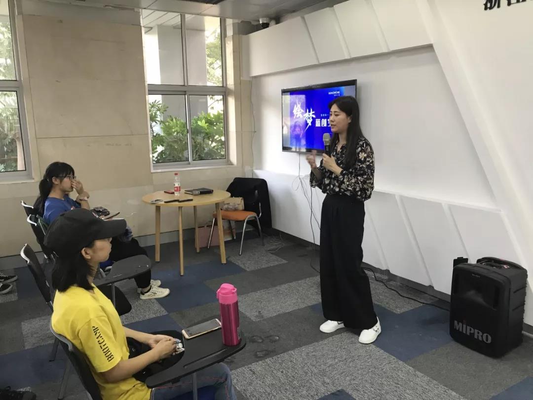 宣讲会即将开始前,主讲人为大家播放了一段杭州绘自传网络科技有限公司的企业宣传片,让同学们了解到本次活动方的企业文化和服务输出,随后便是本次活动的宣讲人超校联盟的创业导师、绘梦蓝创空间的负责人俞恺灵进行宣讲。