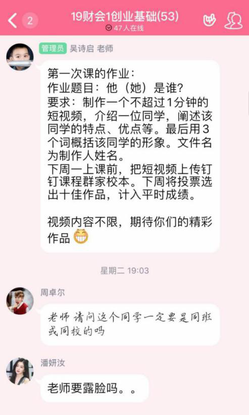 线上见面教学,避免把书上的内容,再讲一遍,而是要利用线上见面教学的优势,对教学的内容进行重新组织。如《创业基础》课程,这门课程理论部分由员工从智慧树线上教学获得,而线下都是由实验实验和实训组成,如何在线上进行实训呢?对此,我们课程小组进行了一次又一次的讨论,对方案进行了不断的修改。譬如,原来课堂中同学间的上讲台相互介绍,改为制作视频介绍,对具体的要求,像是不是要进行场景设定、视频文件名如何确定、视频文件上传到何处等,也是做了多次修改(如图1),使之能够在线上教学的时候更加通畅,员工体验感更好。