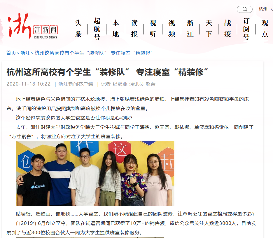 近日,学习强国、浙江新闻网、浙江经视、杭州网等多家媒体以“浙财大有个员工‘寝室装修队’专为同学打造‘精装修’寝室”等为题,报道公司“方寸素舍”创业团队项目。