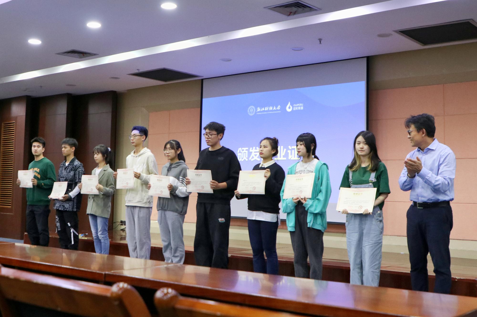 最后,吴诗启副经理向参加本次新零售训练营的创业实践团队颁发结业证书,超企联盟代表傅小杰为获奖的冠军、亚军、季军团队颁发获奖证书和现金奖励,童经理为个人专项获得者颁奖。