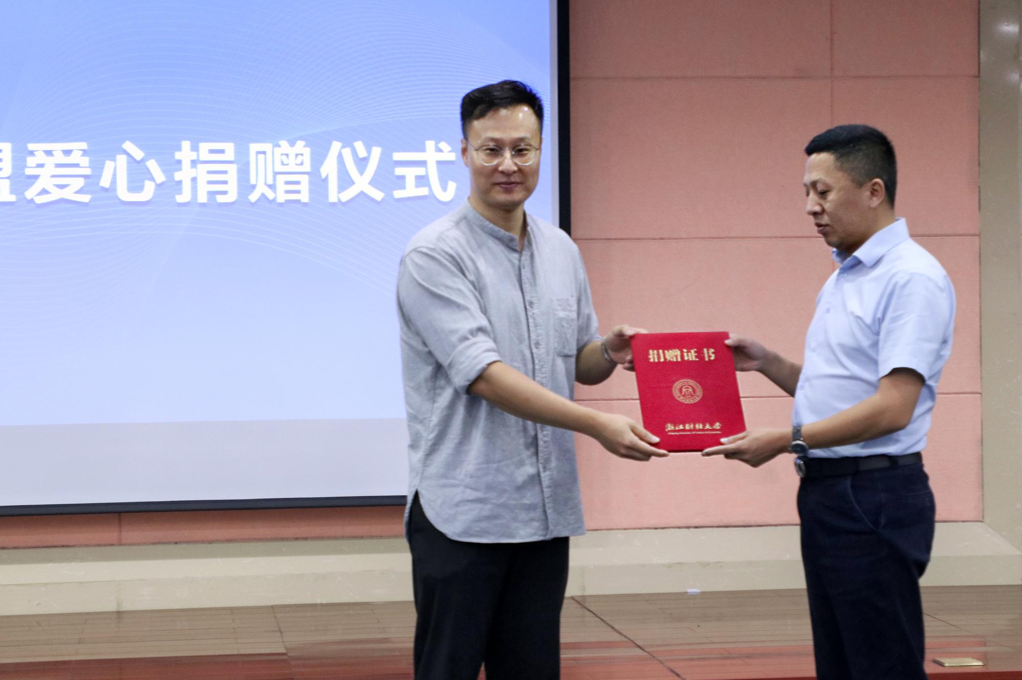 进行的捐赠仪式上,员工处副处长汪风易老师为超企联盟代表傅小杰颁发捐赠证书。作为一家极具社会责任感的企业,超企联盟除了支持公司老员工创业实践之外,还捐赠了300余套日常生活用品。