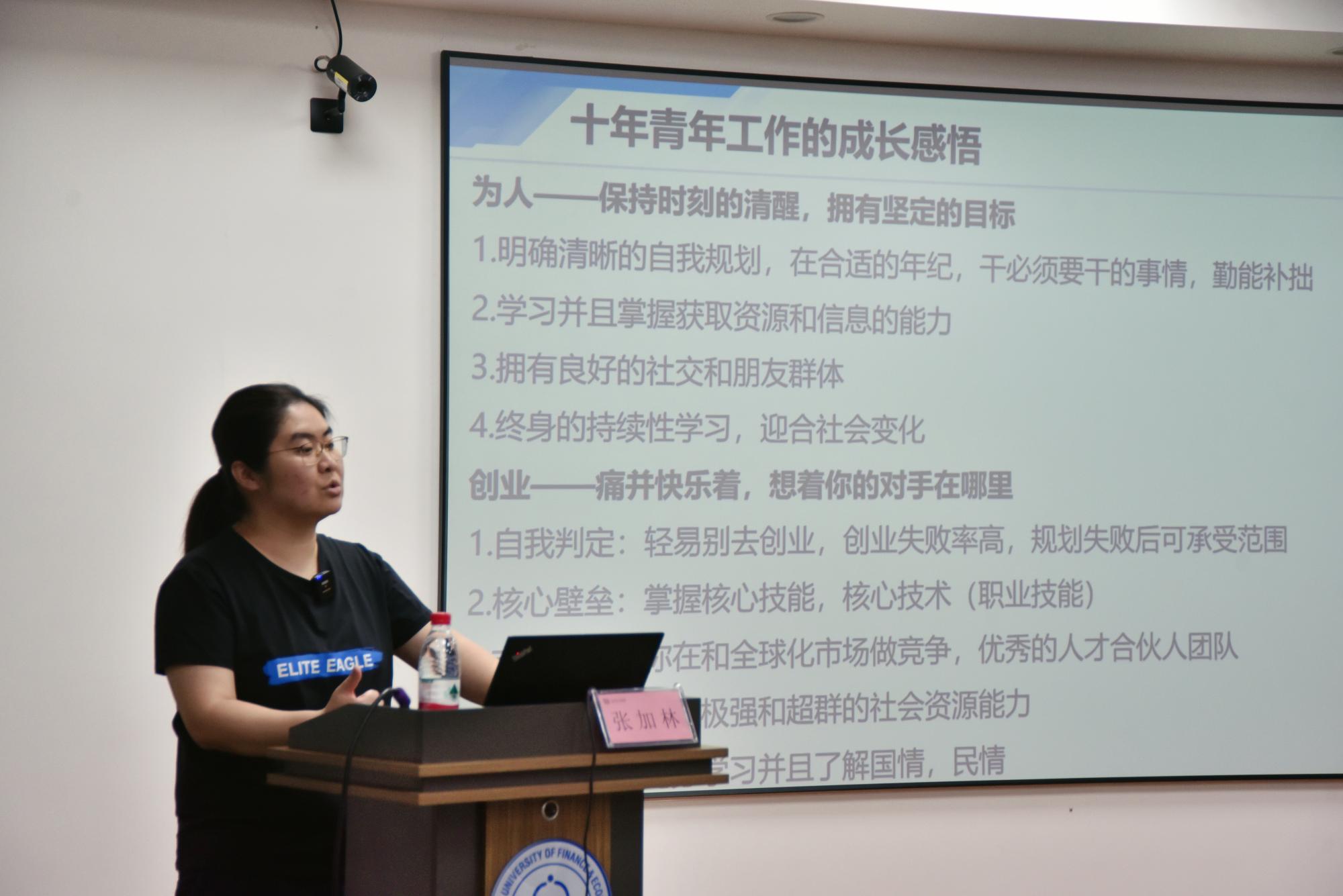 随后,张加林以自己的大学经历为例,讲述了老员工应该如何从员工工作走向创新创业。她指出大学有四寻,即寻平台、寻同道、寻导师、寻方向,为自己的创业之路做好铺垫。同时也说明了积极参加员工会等各种员工工作的重要性,在其中反思得来的经验以及自我的成长对未来的创新创业有很大的帮助。此外,她还强调了老员工应当踏实肯干,在实习这条由老员工走向社会人的路上审视自己,发现长处并弥补不足,为创新创业打下基础。