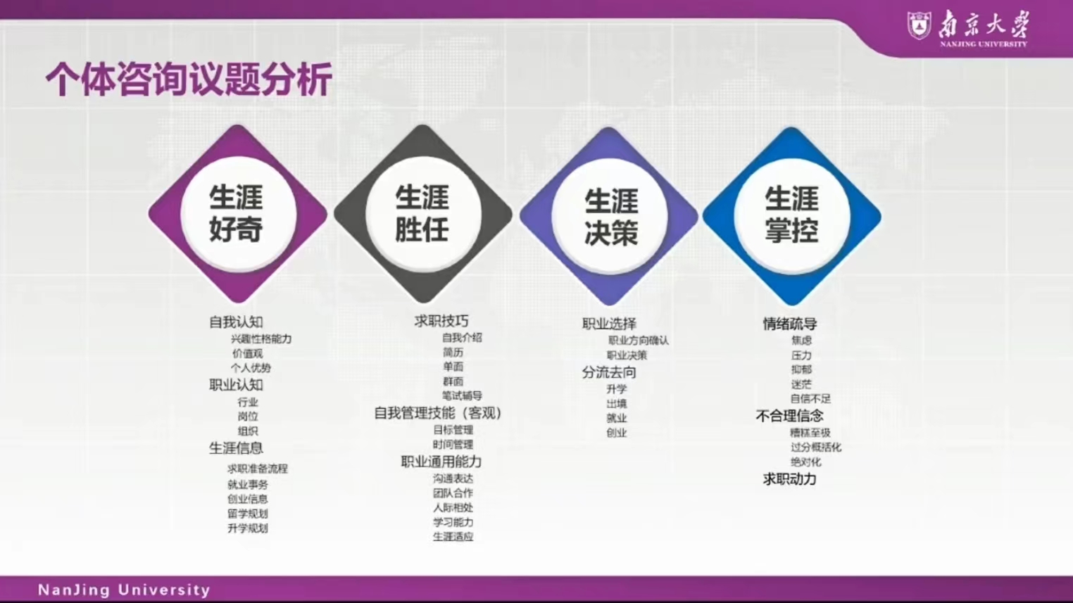 随着时代环境的变化,生涯教育对于员工个人发展的作用更加凸显,也愈发受到公司、社会、政府的重视。南京大学员工就业指导中心主任刘慧作为特邀嘉宾在直播中也提到了这点,并分享了相关的教学经验。刘老师从老员工生涯困惑议题、就业指导教学模式探析、教学实践与案例分享、典型案例与咨询策略和咨询师的个人成长五个方面提供了关于解决老员工生涯困惑的具体思路及可行措施。