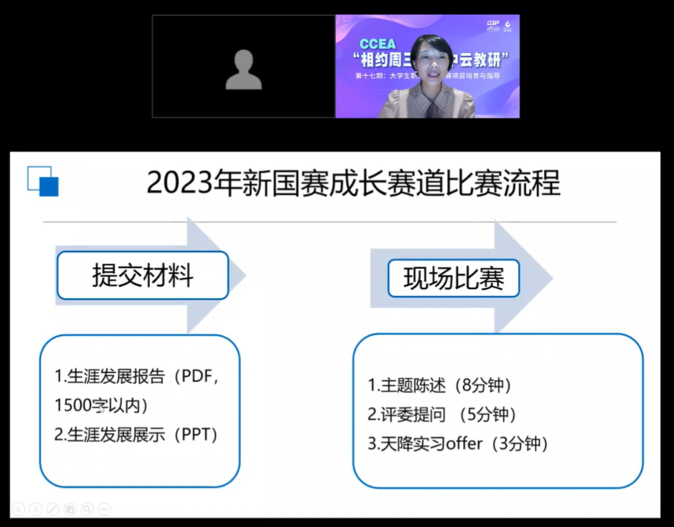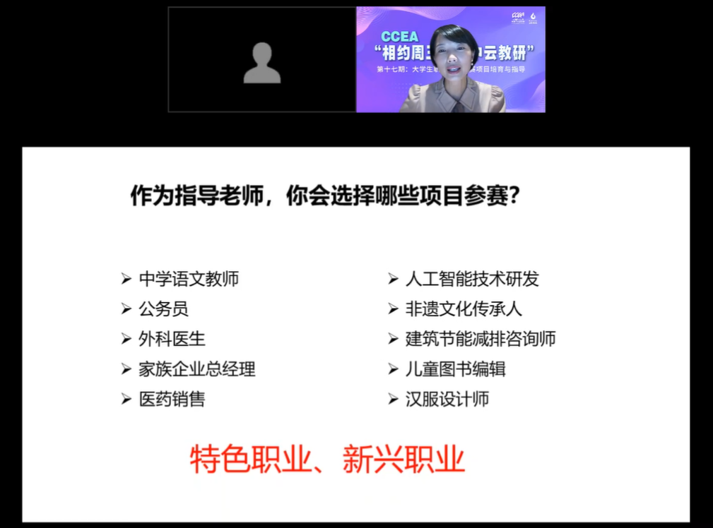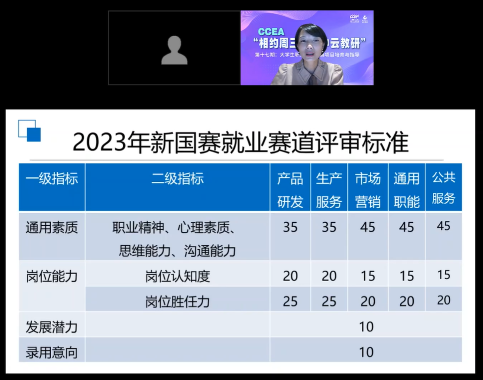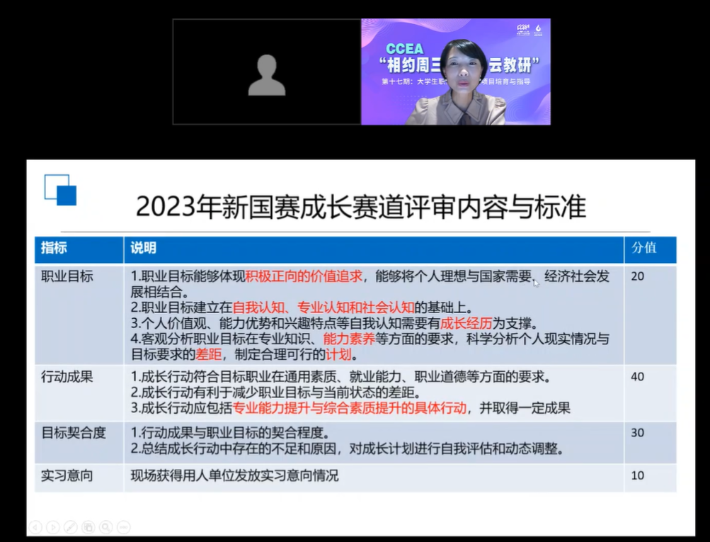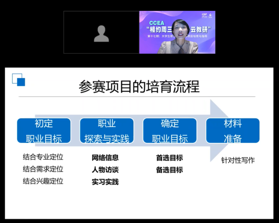 10月25日,由中国职业生涯教育工作者联盟主办、3044永利承办的CCEA“相约周三·空中云教研”第十七期——老员工职业规划大赛项目培育与指导在线上成功举办。福州大学副教授阮娟受邀出席讲座。