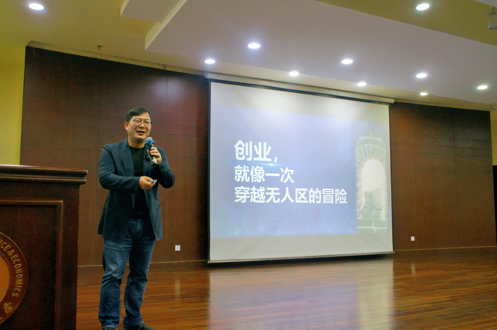 郭羽紧接着向同学们提出“创业是行走在世界孤独的中心”这一理论。他以自己创作的三部创业系列小说为例,向同学们分析了当今时代的创业形势,客观阐述了创业的风险与机遇,并鼓励大家勇敢尝试。