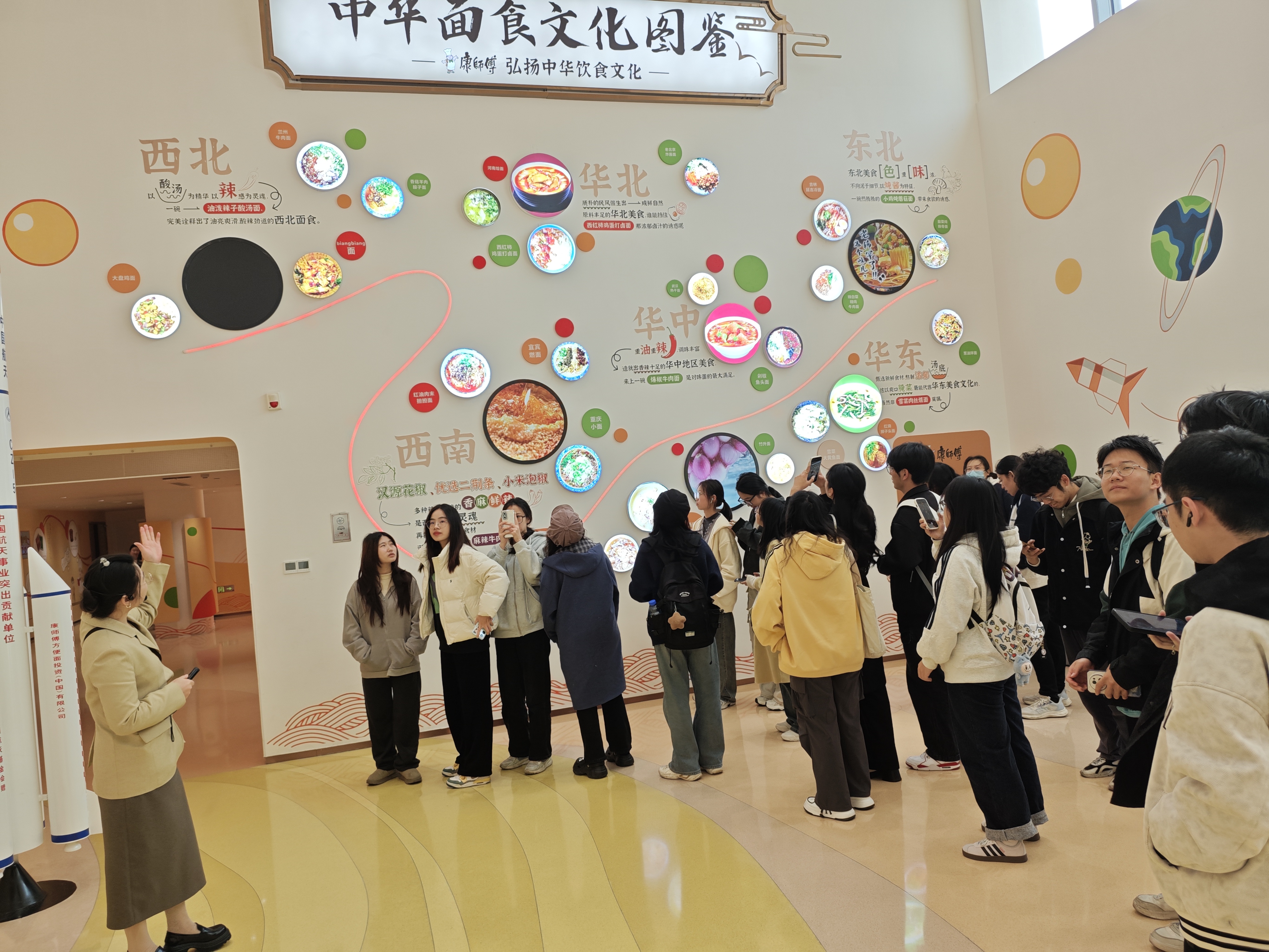 11月22日,3044永利2024年师友计划职场体验行带领35名员工走进康师傅梦想探索乐园,在味觉与视觉的交织中触摸食品行业的创新密码,在文化与技术的碰撞中深化对创新创业的理解。康师傅梦想探索乐园作为全国首创的方便面体验馆,此次为同学们打开了“文化+科技”的双重探索之门。步入展览馆,一面“中华面食文化图鉴”墙率先吸引了大家的目光,讲解员结合图鉴详解各地面食的历史脉络,从秦汉“汤饼”到现代速食,从地域口味差异到产品创新逻辑,让同学们在文化传承中读懂“需求驱动创新”的商业本质。