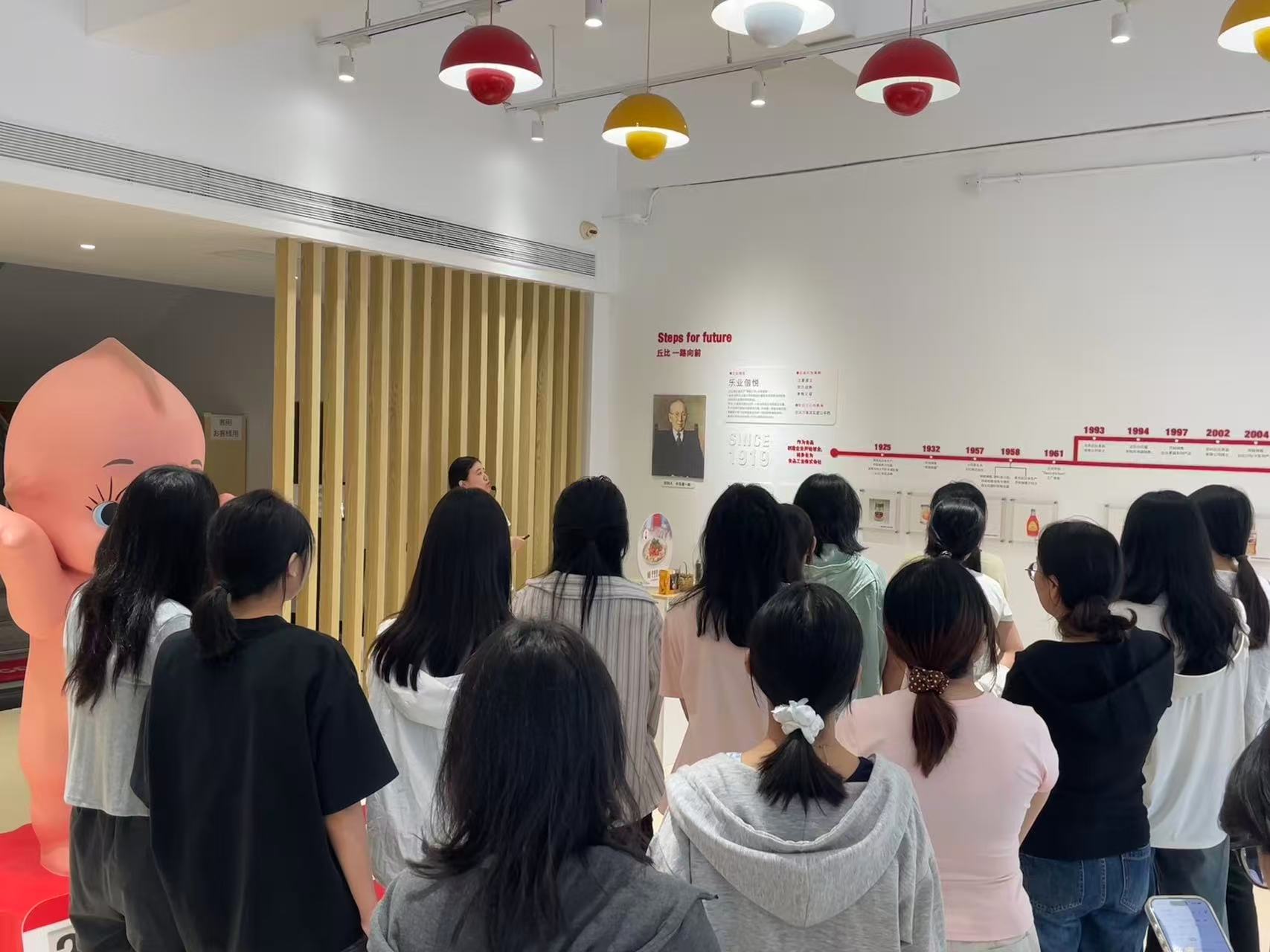 活动当天,同学们在企业讲解员的引导下,首先踏入品牌历史长廊。从1919年丘比株式会社创立的初心,到2002年杭州丘比落地中国的产业布局,再到沙拉酱、果酱等系列产品的迭代创新,讲解员通过图文与实物展示,生动呈现了企业“乐业偕悦”的经营理念与“注重道义、努力创新”的行为准则。墙上的时间轴清晰标注着企业从单一产品到多元矩阵的发展轨迹,让员工们直观理解“品牌是生产商与顾客之间的约定”这一核心逻辑。