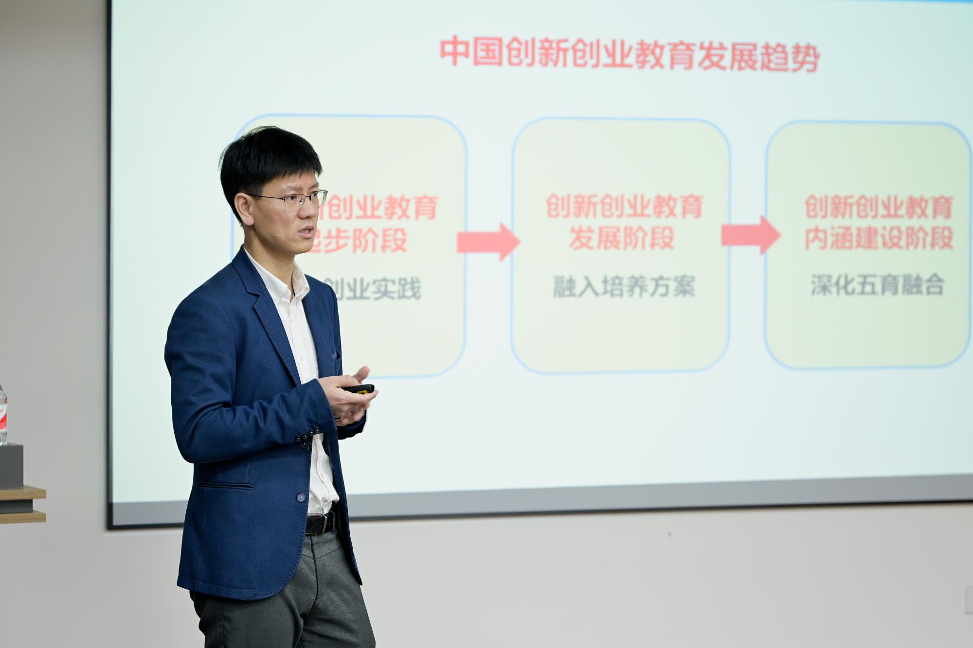 第一部分中,施教授说:“新的趋势是大的背景。”并多次强调创新创业教育需要和德智体美劳相融合,并将其专业化。他认为,中国创新创业教育发展趋势分为起步、发展、内涵建设三个阶段,第一阶段中需要关注创业实践,第二阶段中融入培养方案,在第三阶段深化五育融合,并表示创新创业需要强调社会责任感,这也是立德树人的体现。