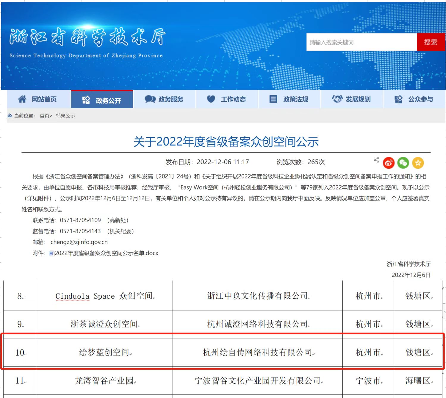 近日,经市科技部门推荐,浙江省科学技术厅审核,由公司联合杭州绘自传网络科技有限公司共同建设的绘梦蓝创空间入选2022年度浙江省省级众创空间。